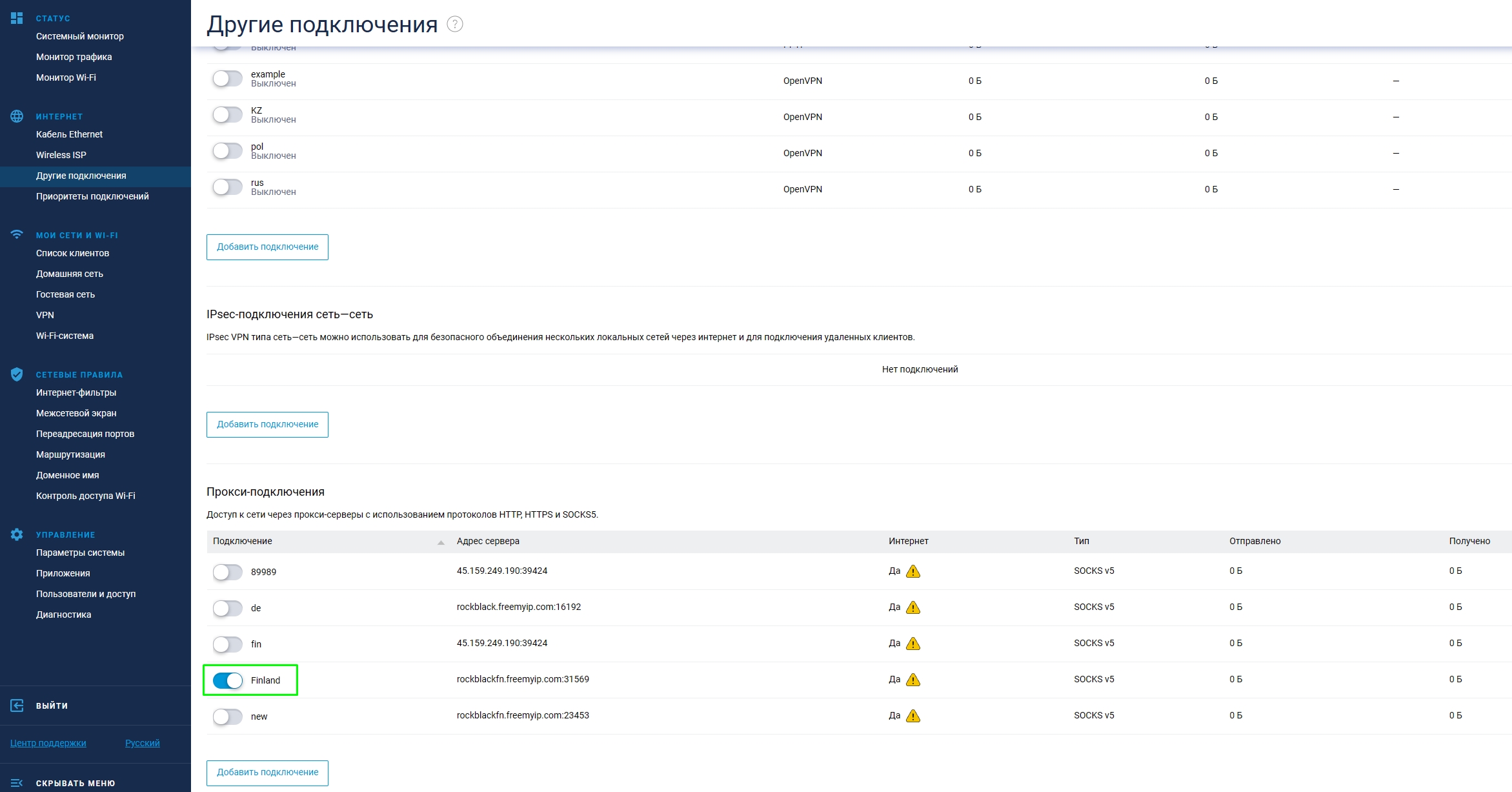 Нажимаем +Добавить политику, даем название, например VPN. Затем Ставим птичку на proxy socks Finland и перетаскиваем его в самый верх. Нажимаем кнопку Сохранить