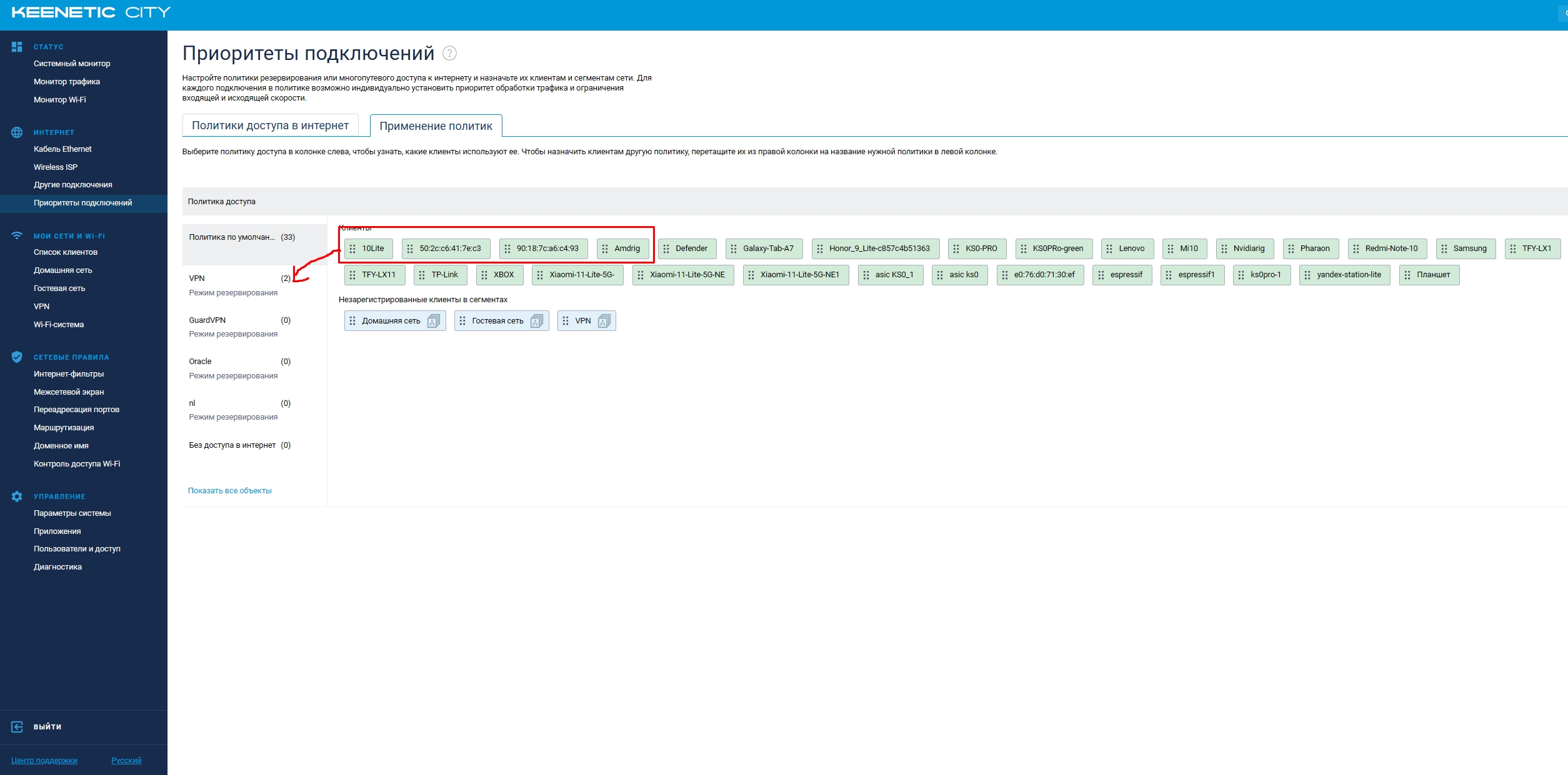 Выбираем нужные устройства, которые будут работать под VPN и перемещаем в созданный профиль VPN и нажимаек кнопку "Подтвердить"